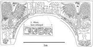 Nasr (Arabic: نسر "Vulture") was apparently a pre-Islamic Arabian deity of the Himyarites.[1] Reliefs depicting vultures have been found in Himyar, including at Maṣna'at Māriya and Haddat Gulays,[2] and Nasr appears in theophoric names.[3][4] Nasr has been identified by some scholars with Maren-Shamash,[3][5] who is often flanked by vultures in depictions at Hatra.[6] Hisham ibn Al-Kalbi's Book of Idols describes a temple to Nasr at Balkha, an otherwise unknown location.[7] Some sources attribute the deity to "the dhū-l-Khila tribe of Himyar".[8][9][10][11] Himyaritic inscriptions were thought to describe "the vulture of the east" and "the vulture of the west", which Augustus Henry Keane interpreted as solstitial worship;[12] however these are now thought to read "eastward" and "westward" with n-s-r as a preposition.[1][lower-alpha 1] J. Spencer Trimingham believed Nasr was "a symbol of the sun".[15]