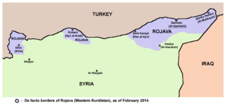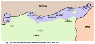 The Democratic Federation of Northern Syria (DFNS), formerly and still commonly known as Rojava, is a de facto autonomous region in northern Syria. It consists of three self-governing regions:[5] Afrin Region, Jazira Region, and Euphrates Region.[6] The region gained its de facto autonomy in 2012[7] as part of the ongoing Rojava conflict and the wider Syrian Civil War. While entertaining some foreign relations, the DFNS is not officially recognized as autonomous by the government of Syria or any international state or organization.[8][9]