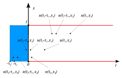where \(u_0\) is a known initial function. Here, the width of the furnace, which is considered in Wang (1963), is normalized and equal to \(1\ .\) The conditions (9) are illustrated in Figure 1 by the blue rectangle (initial set) and the red segments (bounderies). The initial function \(u_0\) is defined on the blue rectangle. Therefore, the values \(u(t_0-\tau_1,x_0)=u_0(t_0-\tau_1,x_0)\ ,\) \(u(t_0-\tau_2,x_0)=u_0(t_0-\tau_2,x_0)\) are known from (9) and can be used for (1) to determine \(u(t_0,x_0)\ .\) The value \(u(t_1,x_1)\) is joined in (1) with \( u(t_1-\tau_1,x_1)=u_0(t_1-\tau_1,x_1), \) known from (9), and with \(u(t_1-\tau_2,x_1)\ ,\) which is not defined by (9) but can be determined like \(u(t_0,x_0)\ .\) The value \(u(t_2,x_2)\) is joined in (1) with \(u(t_2-\tau_1,x_2)\ ,\) \(u(t_2-\tau_2,x_2)\ ,\) which are not defined by (9), and have to be determined from (1).