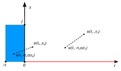 Rey & Mackey (1993) have considered different initial and boundary functions \(\varphi\) and \(\psi\) for (2) and (10). Conditions (10) are illustrated in Figure 2 by the blue rectangle, for the initial condition, and the red segment for the boundary condition. Here, the value \(u(t_0-\tau,\alpha x_0)=u_0(t_0-\tau,\alpha x_0)\) is known from (10) and can be used in (2) to determine \(u(t_0,x_0)\ .\) On the other hand, \(u(t_1-\tau,\alpha x_1)\) is not given by (10) and both values, \(u(t_1,x_1)\) and \(u(t_1-\tau,\alpha x_1)\) have to be determined from (2).