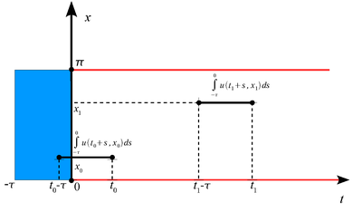 (see Green and Stech (1981)). In Figure 3, the initial condition is illustrated by the blue rectangle and the boundary conditions are illustrated by the red segments. For (3), the integrals \(\int_{-\tau}^{0} u(t_0+s,x_0) ds\) and \(\int_{-\tau}^{0} u(t_1+s,x_1) ds\) have to be determined differently. Here, \[\tag{12} \int_{-\tau}^{0} u(t_0+s,x_1) ds = \int_{-\tau}^{-t_0} u_0(t_0+s,x_1) ds + \int_{-t_0}^{0} u(t_0+s,x_1) ds \]