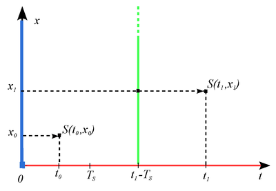 Figure 4 illustrates (13)-(14). Note that since \(I(t,x;T_S)=0\ ,\) for \(t<T_S\) (by (5)), no values of \(G_1\) are needed for \(t<0\) and the initial set is the positive part of the \(x\)-axis (in blue). Therefore, the value \(S(t_0,x_0)\) can be determined from (4) with \(I(t_0,x_0;T_S)=0\ .\) However, \(S(t_1,x_1)\) has to be determined from (4) with \(I(t_1,x_1;T_S)=\int_{0}^{\infty }k_1G_1(t_1-T_S,y)\gamma (T_S,x,y)dy\) (by (5)), which needs information about the behavior of \(G_1\) on the green line \(t=t_1-T_S\ .\) (14) is the same zero flux boundary condition that often supplements non-delay partial differential equations.