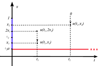 They have been formulated by Diekmann et al. (1984) and are illustrated in Figure 5. Equation (8) is imposed for \(\frac{a}{2}\leq x \leq 1\ ,\) \(t>0\ .\) Here, \(0<a<1\) is a minimal size of cells and \(u_0\) represents an initial density function, which is defined on the initial set illustrated by the blue segment in Figure 5. Since Diekmann et al. (1984) interpret the functional term \(4b(2x)u(t,2x)\) in (8) as zero whenever \(x\geq \frac{1}{2}\ ,\) \(u(t_2,x_2)\) has to be determined from (8) with \(4b(2x_2)u(t_2,2x_2)=0\ .\) However, the value \(u(t_1,x_1)\) has to be determined from (8) with \(4b(2x_1)u(t_1,2x_1)\ne 0\) (because \(x_1 < \frac{1}{2}\)) and \(u(t_1,2x_1)\) has to be determined like \(u(t_2,x_2)\ .\)