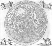 Michiel Florent van Langren was an early-modern pioneer in the history of lunar cartography and selenography.[7] The first serious denominations of the surface features of the Moon, based on telescopic observation, were made by Van Langren in 1645. His work is considered the first true cartograph (map) of the Moon because it demarcated the various lunar maria, craters, and mountains and ranges.[8][9] Many of his denominations were distinctly Catholic, denominating craters in honor of Catholic royalty and capes and promontories in honor of Catholic saints. The lunar maria were denominated in Latin for terrestrial seas and oceans. Minor craters were denominated in honor of astronomers, mathematicians, and other famous scholars.