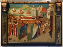 Some relics were translated from place to place, buffeted by the tides of wars and conflicts. The relics of Saint Leocadia were moved from Toledo to Oviedo during the reign of Abd ar-Rahman II, and from Oviedo they were brought to Saint-Ghislain (in present-day Belgium). Her relics were venerated there by Philip the Handsome and Joanna of Castile, who recovered for Toledo a tibia of the saint. Fernando Álvarez de Toledo, 3rd Duke of Alba attempted unsuccessfully to rescue the rest of her relics.[13] Finally, a Spanish Jesuit, after many travels, brought the rest of the saint's relics to Rome in 1586. From Rome they were brought to Valencia by sea, and then finally brought to Toledo from Cuenca. Philip II of Spain presided over a solemn ceremony commemorating the final translation of her relics to Toledo, in April 1587.[13]