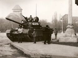 ↑"1968 – The Prague Spring" (in en-US). https://www.austria1989.org/1968. "In the morning hours of August 21, 1968, Soviet and Warsaw Pact tanks roll in the streets of Prague; to distinguish them from Czechoslovak tanks, they are marked with white crosses."