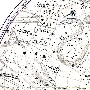Solarium (Latin for sundial) was a constellation located between the constellations of Horologium, Dorado and Hydrus. It was introduced in 1822 on the Celestial Atlas of Alexander Jamieson, who substituted it for the constellation Reticulum invented by Nicolas Louis de Lacaille.[1] A decade later it was picked up by Elijah Hinsdale Burritt[2] to whom it is sometimes attributed. It was never popular and is no longer in use.