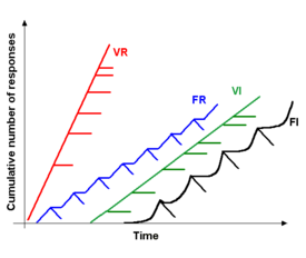 A chart demonstrating the different response rate of the four simple schedules of reinforcement, each hatch mark designates a reinforcer being given