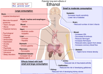 Having more than one drink a day for women or two drinks for men increases the risk of heart disease, high blood pressure, atrial fibrillation, and stroke.[40] Risk is greater with binge drinking, which may also result in violence or accidents. About 3.3 million deaths (5.9% of all deaths) are believed to be due to alcohol each year.[14] Alcoholism reduces a person's life expectancy by around ten years[21] and alcohol use is the third leading cause of early death in the United States.[40] Long-term alcohol misuse can cause a number of physical symptoms, including cirrhosis of the liver, pancreatitis, epilepsy, polyneuropathy, alcoholic dementia, heart disease, nutritional deficiencies, peptic ulcers[41] and sexual dysfunction, and can eventually be fatal. Other physical effects include an increased risk of developing cardiovascular disease, malabsorption, alcoholic liver disease, and several cancers. Damage to the central nervous system and peripheral nervous system can occur from sustained alcohol consumption.[42][43] A wide range of immunologic defects can result and there may be a generalized skeletal fragility, in addition to a recognized tendency to accidental injury, resulting in a propensity for bone fractures.[44]