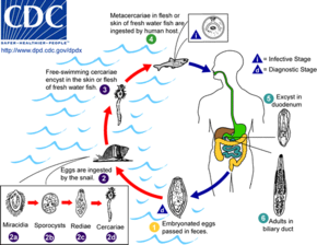↑Sripa B, Kaewkes S, Intapan PM, Maleewong W, Brindley PJ (2010). Food-borne trematodiases in Southeast Asia epidemiology, pathology, clinical manifestation and control. Advances in Parasitology. Vol. 72. pp. 305–50. doi:10.1016/S0065-308X(10)72011-X. ISBN9780123815132. PMID20624536.