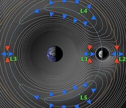 Another near-Earth possibility are the stable Earth–Moon Lagrange points L4 and L5, at which point a space colony can float indefinitely. The L5 Society was founded to promote settlement by building space stations at these points. Gerard K. O'Neill suggested in 1974 that the L5 point, in particular, could fit several thousands of floating colonies, and would allow easy travel to and from the colonies due to the shallow effective potential at this point.[47]