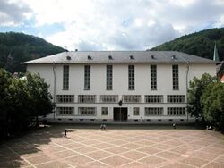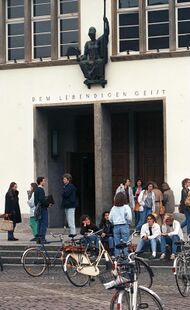 During the 1960s and 1970s, the university grew dramatically in size. At this time, it developed into one of the main scenes of the left-wing student protests in Germany.[39] In 1975, a massive police force arrested the entire student parliament AStA. Shortly thereafter, the building of the Collegium Academicum, a progressive college in immediate vicinity to the university's main grounds, was stormed by over 700 police officers and closed once and for all. On the outskirts of the city, in the Neuenheimer Feld area, a large campus for medicine and natural sciences was constructed.[30]