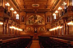 The so-called New University is regarded as the center of the Old Town Campus. It is situated at the Universitätsplatz (University Square) in the pedestrian zone, in direct vicinity to the University Library and to the main administration buildings. The New University was officially opened in 1931. Its erection was largely financed by donations of wealthy American families, in line with a fundraising campaign of Jacob Gould Schurman, an alumnus of Heidelberg University and former United States Ambassador to Germany.[46] It houses the new assembly hall, the largest lecture halls, and a number of smaller seminar rooms, mostly used by faculties of humanities and social sciences. Education in humanities and social sciences takes place to a great extent in buildings spread over the ancient part of town, though most are less than ten minutes walk from University Square. The faculties maintain their own extensive libraries and work spaces for students. Seminars and tutorials are usually held in the faculty buildings.[45]