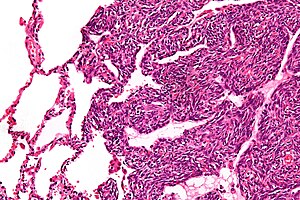 Two cell types can be seen microscopically in synovial sarcoma. One fibrous type, known as a spindle or sarcomatous cell, is relatively small and uniform, and found in sheets. The other is epithelial in appearance. Classical synovial sarcoma has a biphasic appearance with both types present. Synovial sarcoma can also appear to be poorly differentiated or to be monophasic fibrous, consisting only of sheets of spindle cells. Some authorities[3] state that, extremely rarely, there can be a monophasic epithelial form which causes difficulty in differential diagnosis. Depending on the site, there is similarity to biphenotypic sinonasal sarcoma, although the genetic findings are distinctive.