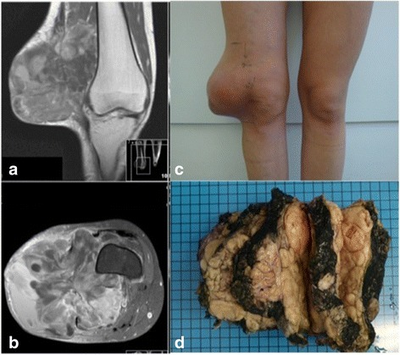 The name "synovial sarcoma" was coined early in the 20th century, as some researchers thought that the microscopic similarity of some tumors to synovium, and its propensity to arise adjacent to joints, indicated a synovial origin; however, the actual cells from which the tumor develops are unknown and not necessarily synovial.[3]Primary synovial sarcomas are most common in the soft tissue near the large joints of the arm and leg but have been documented in most human tissues and organs, including the brain, prostate, and heart.