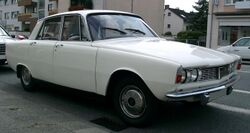 The company's other major project at this time was the P8, a successor, styled by David Bache, for the 3-litre.[6] The car's shape owed much to Detroit, with a front bumper concealed under a "bumperless" polyurethane nose, in a manner reminiscent of contemporary Pontiacs, and a side profile reminiscent of a slightly chunkier Opel Rekord.[6] Although the original brief was for the car to be no longer externally than a Rover 2000, management changes led the project to be redefined as it progressed, and the P8 scheduled for launch at the 1971 London Motor Show was substantially larger than any existing Rover sedan, with the Rover V8 engine expanded for this application to 4.4 litres.[6] The car followed the P6 in employing a steel frame structure with bolt-on steel or aluminium panels. The manufacturer was nevertheless short of cash and focus at this time: the P8 was one of several new model projects subjected to a slipping time-line.[6] By the revised launch date towards the end of 1972 the considerable development costs had been expended and pre-production prototypes had even undergone extensive testing in Finland . Production capacity had been set aside for the P8 at the Solihull plant.[6] However, an expenditure review in 1970 found the project subjected to criticism from Sir William Lyons, by now an influential member of the British Leyland board: speculation has arisen that Lyons saw the car as a threat to future investment in the recently launched Jaguar XJ6.[6] It later emerged that Rover's contender would not have been particularly cheap or easy to build, and the shrinkage of the European market for sedans of this size that followed the 1973 oil price shock suggest that abandonment of the project in 1972 – even at the eleventh hour – may have been the right decision for British Leyland; but the P8 was not entirely ummourned nearly thirty years later.[6] Some of the P8's styling cues turned up two years later on the Leyland P76, and the driver's view of the instrument panel (albeit without the Austin Allegro style "quartic" steering wheel that appears in one of the surviving pictures of it) would have been not entirely unfamiliar to the driver of a 1976 Rover 3500.[6]