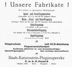 In November 1925 test pilot Antonius Raab and engineer Katzenstein formed the Kassel-based company that bears their name. They had previously worked at Dietrich Flugzeugwerke, a company which ran into financial problems in 1925. Their first design, known initially as the KL.1 Schwalbe, was a development of the Dietrich-Gobiet DP.XI. Later, in a rationalisation of the company's naming system, it became the RK.1 Schwalbe.[1][2]