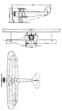 The Schwalbe's rectangular section fuselage had a steel tube structure and was fabric covered. The first examples, designated KL.IA, were powered by a 60 kW (80 hp) Siemens-Halske Sh 11 seven cylinder radial engine, partially enclosed by a dural cowling which left the cylinders projecting for cooling. Its fuel tank was within the upper wing and the oil tank behind a firewall.[1] Two later versions of the Schwalbe, designated KL.1B and KL.IC, were powered by a 82 kW (110 hp) Siemens-Halske Sh 12 nine cylinder radial.[2] The forward open cockpit was under the wing but it was flown solo from the rear cockpit which was over the trailing edge of the lower wing and behind that of the upper wing, where there was a cut-out to increase the pilot's field of view.[1]
