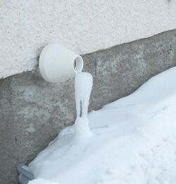 Plastic outlet for a condensing natural gas hot air furnace. Not all the water vapor is condensed; some freezes at the outlet. This vent contains a coaxial combustion air inlet pipe. Blowing snow can block the pipe, but the furnace control can detect this condition and prevent the burner from starting.