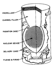 A proposed means of averting an asteroid impacting with Earth, assuming short lead times between detection and Earth impact, is to detonate one, or a series, of nuclear explosive devices, on, in, or in a stand-off proximity orientation with the asteroid,[65] with the latter method occurring far enough away from the incoming threat to prevent the potential fracturing of the near-Earth object, but still close enough to generate a high thrust laser ablation effect.[66]