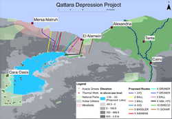 The Qattara Depression Project was developed by Professor Friedrich Bassler during his appointment to the West German ministry of economics in 1968. He put forth a plan to create a Saharan lake and hydroelectric power station by blasting a tunnel between the Mediterranean Sea and the Qattara Depression in Egypt, an area that lies below sea level. The core problem of the entire project was the water supply to the depression. Calculations by Bassler showed that digging a canal or tunnel would be too expensive, therefore Bassler determined that the use of nuclear explosive devices, to excavate the canal or tunnel, would be the most economical. The Egyptian government declined to pursue the idea.[29]
