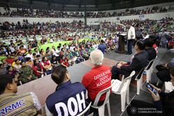 President Rodrigo Duterte, who was in Davao City during the eruption, ordered Executive Secretary Salvador Medialdea to suspend classes and government work in Calabarzon, Central Luzon and Metro Manila. President Duterte flew to Manila on the morning of January 13 and continued with his scheduled activities there.[96] Duterte visited evacuees in Batangas City on January 14, 2020, and pledged to provide financial assistance worth ₱130 million ($2.6 million) to the affected residents.[97] He approved the recommendation of Defense Secretary Delfin Lorenzana to prohibit individuals from visiting or inhabiting the Taal island, declaring it a "no man's land".[98] While addressing evacuees in Batangas City, President Duterte also pushed for the construction of additional evacuation centers to be built "simultaneously" in disaster-prone areas during his administration.[99] Concurrently, Vice President Leni Robredo visited the municipalities of Santa Teresita and San Jose, and the city of Santo Tomas in Batangas, where she helped distribute food packs and face masks to the affected residents.[100] Robredo stressed the lack of medicines, toilets, toiletries and sleeping mats being provided to them, other than food and water. She also requested local officials to prepare an inventory of the damage.[101]