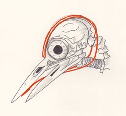 Computer simulations have shown that 99.7% of the energy generated in pecking is stored in the form of strain energy, which is distributed throughout the bird's body, with only a small remaining fraction of the energy going into the brain. The pecking also causes the woodpecker's skull to heat up, which is part of the reason why they often peck in short bursts with brief breaks in between, giving the head some time to cool.[14] During the millisecond before contact with wood, a thickened nictitating membrane closes, protecting the eye from flying debris.[15] These membranes also prevent the retina from tearing. Their nostrils are also protected; they are often slit-like and have special feathers to cover them. Woodpeckers are capable of repeated pecking on a tree at high decelerations on the order of 10,000 m/s2 (33,000 ft/s2) (1000 g).[16]