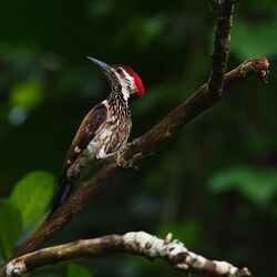 The name Picidae for the family was introduced by English zoologist William Elford Leach in a guide to the contents of the British Museum published in 1819.[48][49] The phylogeny has been updated according to new knowledge about convergence patterns and evolutionary history.[50][51] Most notably, the relationship of the Picinae genera has been largely clarified, and the Antillean piculet was found to be a surviving offshoot of protowoodpeckers. Genetic analysis supports the monophyly of the Picidae, which seem to have originated in the Old World, but the geographic origins of the Picinae is unclear. The Picumninae are returned as paraphyletic.[50] Morphological and behavioural characters, in addition to DNA evidence, highlights genus Hemicircus as the sister group of all remaining true woodpeckers, besides a sister-group relationship between the true woodpecker tribes Dendropicini and Malarpicini.[52]