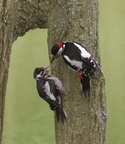 Group-living species tend to be communal group breeders.[25] In addition to these species, a number of species may join mixed-species foraging flocks with other insectivorous birds, although they tend to stay at the edges of these groups. Joining these flocks allows woodpeckers to decrease their anti-predator vigilance and increase their feeding rate.[26] Woodpeckers are diurnal, roosting at night inside holes and crevices. In many species the roost will become the nest-site during the breeding season, but in some species they have separate functions; the grey-and-buff woodpecker makes several shallow holes for roosting which are quite distinct from its nesting site. Most birds roost alone and will oust intruders from their chosen site, but the Magellanic woodpecker and acorn woodpecker are cooperative roosters.[25]