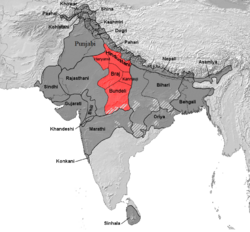 Western Hindi languages. Clockwise from the top: Hindustani, Kannauji, Bundeli, Braj, Haryanvi. The Eastern Hindi languages are not shown individually. They are Awadhi in the north, east of Hindustani and Kannauji; Bagheli in the center, to the east of Bundeli, and Chhattisgarhi to the southeast of Bundeli.