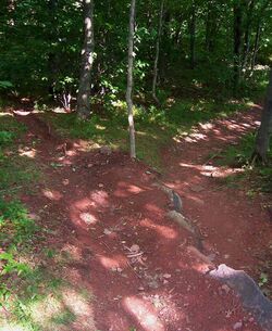 A water bar or interceptor dyke is a road or trail construction feature that is used to prevent erosion on sloping roads, cleared paths through woodland (for utility companies such as electricity pylons), or other accessways by reducing flow length. It is a diagonal channel across the road that diverts surface water (that would otherwise flow down the whole length of the road) off the road and into a stable drain way. By constructing a series of water bars at intervals along a road, the volume of water flowing down the road is reduced. Without water bars, flooding, washouts, and accelerated road degradation can occur.