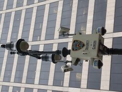 Wireless security cameras on a lamp post deployed by New York City Police Department. They are connected to the municipal NYC Wireless Network (NYCWiN).