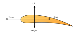 The force created by propellers and jet engines is called thrust, and is also an aerodynamic force (since it acts on the surrounding air). The aerodynamic force on a powered airplane is commonly represented by three vectors: thrust, lift and drag.[3]:151[1]:§ 14.2