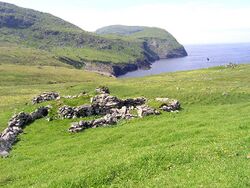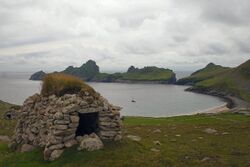 Boreray boasts the Cleitean MacPhàidein, a "cleit village" of three small bothies used on a regular basis during fowling expeditions. Here too are the ruins of Taigh Stallar (the steward's house), which was similar to the Amazon's house in Gleann Mòr although somewhat larger, and which had six bed spaces. The local tradition was that it was built by the "Man of the Rocks", who led a rebellion against the landlord's steward.[137] It may be an example of an Iron Age wheelhouse and the associated remains of an agricultural field system were discovered in 2011.[138][139][140] As a result of a smallpox outbreak on Hirta in 1724, three men and eight boys were marooned on Boreray until the following May.[141] No fewer than 78 storage cleitean exist on Stac an Armin and a small bothy. A small bothy exists on the precipitous Stac Lee too, also used by fowlers.[142]