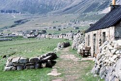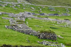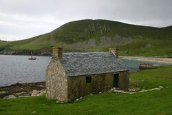 Extensive ruins of field walls and cleitean and the remnants of a medieval 'house' with a beehive-shaped annexe remain. Nearby is the 'Bull's House', a roofless rectangular structure in which the island's bull was kept during winter. Tobar Childa itself is supplied by two springs that lie just outside the Head Wall that was constructed around the Village to prevent sheep and cattle gaining access to the cultivated areas within its boundary.[122] There were 25 to 30 houses altogether. Most were blackhouses of typical Hebridean design, but some older buildings were made of corbelled stone and turfed rather than thatched. The turf was used to prevent the ingress of wind and rain, and the older "beehive" buildings resembled green hillocks rather than dwellings.[123]