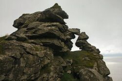Dùn means "fort", and there is but a single ruined wall of a structure said to have been built in the far-distant past by the Fir Bolg.[134] The only "habitation" is Sean Taigh (old house), a natural cavern sometimes used as a shelter by the St Kildans when they were tending the sheep or catching birds.[135] Soay has a primitive hut known as Taigh Dugan (Dugan's house). This is little more than an excavated hole under a massive stone with two crude walls on the sides. The story of its creation relates to two sheep-stealing brothers from Lewis who came to St Kilda only to cause further trouble. Dugan was exiled to Soay, where he died; the other, called Fearchar Mòr, was sent to Stac an Armin, where he found life so intolerable he cast himself into the sea.[136]