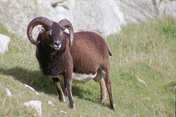 On the inaccessible island of Soay are sheep of a unique type, which lived as feral animals and belonged to the owner of the islands, not to the islanders. These Soay sheep are believed to be remnants of the earliest sheep kept in Europe in the Neolithic Era, and are small, short-tailed, usually brown with white bellies, and have naturally moulting fleeces. About 200 Soay sheep remain on Soay itself, and soon after the evacuation a second feral population of them was established on Hirta, which at that time had no sheep; in 1994 these numbered between 600 and 1,700.[33] A few Soays have been exported to form breeding populations in other parts of the world, where they are valued for their hardiness, small size and unusual appearance.[154] On Hirta and Soay, the sheep prefer the Plantago pastures, which grow well in locations exposed to sea spray and include red fescue (Festuca rubra), sea plantain (Plantago maritima) and sea pink (Armeria maritima).[37]