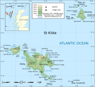 From Handwiki Template:Infobox Scottish island St Kilda (Scottish Gaelic: Hiort) is an isolated archipelago situated 64 kilometres (40 mi) west-northwest of North Uist in the North Atlantic Ocean. It contains the westernmost islands of the Outer Hebrides of Scotland.[note 1] The largest island is Hirta, whose sea cliffs are the highest in the United Kingdom; three other islands (Dùn, Soay and Boreray) were also used for grazing and seabird hunting.[1] The islands are administratively a part of the Comhairle nan Eilean Siar local authority area.[2]:254