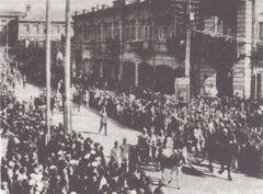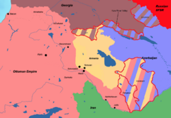 On 11 May, a new peace conference was convened in Batum; the Ottoman delegation stated that as the two states were in conflict, they would no longer recognise Brest-Litovsk and instead presented an alternative treaty by which the TDFR would be also obligated to cede western sectors of the Erivan and Tiflis governorates.[38] Without awaiting the TDFR's consent to the new terms, the Ottomans resumed their offensive in Armenia on 21 May, leading to the battles of Abaran, Karakilisa, and Sardarabad, whereby local Armenian forces emerged victorious.[39] In "avenging" their losses, the Turkish divisions defeated by Armenians massacred several thousand villagers.[39] On 26 May, after secret negotiations with Germany, the Georgian delegates of the Seim declared the independence of Georgia[40]—Azerbaijan followed suit two days later.[41]