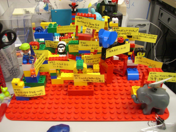 The Tangible Bug Tracking project “is a practice to build a tiny structure which is representation of a software bug. Those are build with LEGO blocks and placed in the team’s workspace. LEGO bricks are represented as the priority, dependency, difficulty of software bugs by developer. It is a kind of information radiator.”. According to the author, Takeshi Kakeda, BUG-LEGO has three benefits: