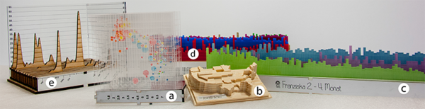 Physical visualizations created with our fabrication tool MakerVis: a) a scatterplot created after Hans Rosling’s TED talk, b) a prism map showing happiness across the US computed from Twitter sentiments, c),d),e) visualizations created by users during design sessions. Source: http://www.aviz.fr/makervis