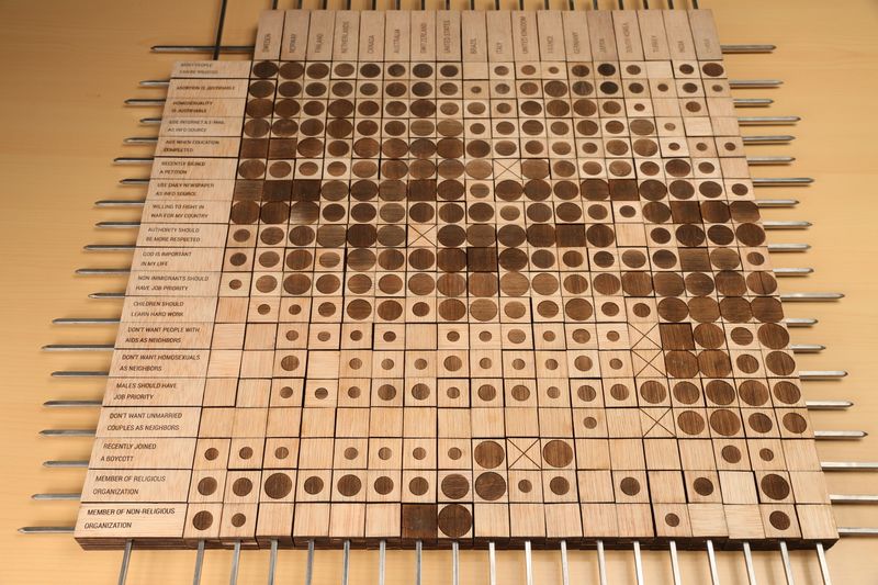 In a paper entitled Can physical visualizations support analytical tasks [4], Stusak et al. (2013) show that physical visualizations, i.e. layered 2D plots made with a laser cutter support a number of analytical tasks identified by Amar et al (2005) [5]. A sculpture represented three variables: The x axis represents energy sources, the y axis countries, and the z axis time. Participants could retrieve values, derived values, extremes, they could sort and determine a range, describe a distribution and find anomalies, clusters and correlations.