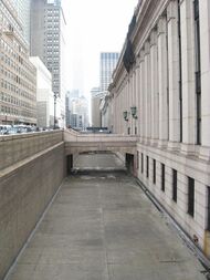 Dry moats were a key element used in French Classicism and Beaux-Arts architecture dwellings, both as decorative designs and to provide discreet access for service. Excellent examples of these can be found in Newport, Rhode Island at Miramar (mansion) and The Elms, as well as at Carolands, outside of San Francisco, California, and at Union Station in Toronto, Ontario, Canada. Additionally, a dry moat can allow light and fresh air to reach basement workspaces, as for example at the James Farley Post Office in New York City .