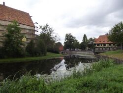 A moat is a deep, broad ditch, either dry or filled with water, that is dug and surrounds a castle, fortification, building or town, historically to provide it with a preliminary line of defence. In some places moats evolved into more extensive water defences, including natural or artificial lakes, dams and sluices. In older fortifications, such as hillforts, they are usually referred to simply as ditches, although the function is similar. In later periods, moats or water defences may be largely ornamental. They could also act as a sewer.