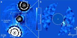 Proxima Centauri has two confirmed planets: Proxima b, an Earth-sized planet in the habitable zone discovered in 2016, and Proxima d, a candidate sub-Earth which orbits very closely to the star, announced in 2022.[17] The existence of Proxima c, a mini-Neptune 1.5 AU away discovered in 2019, is controversial.[18] Alpha Centauri A may have a Neptune-sized planet in the habitable zone, though it is not yet known with certainty to be planetary in nature and could be an artifact of the discovery mechanism.[19] Alpha Centauri B has no known planets: planet Bb, purportedly discovered in 2012, was later disproven,[20] and no other planet has yet been confirmed.