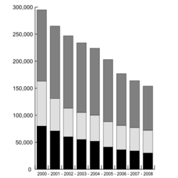 Global employment at Unilever 2000–08 Black represents employment numbers in Europe, light grey represents the Americas and dark grey represents Asia and Africa. Between 2000 and 2008 Unilever reduced global workforce numbers by 41%, from 295,000 to 174,000. Notes: Europe figures for 2000–2003 are all Europe; from 2004 figures in black are Western Europe. For 2004–2008 figures for Asia and Africa include Eastern and Central Europe. Source: Unilever Annual Reports 2004, 2008