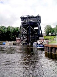 Canal aqueducts are structures that carry a canal across a valley, road, railway, or another canal. Dundas Aqueduct is built of stone in a classical style. Pontcysyllte Aqueduct is an iron trough on tall stone piers. Barton Swing Aqueduct opens to let ships pass underneath on the Manchester Ship Canal. Three Bridges, London is a clever arrangement allowing the routes of the Grand Junction Canal, a road, and a railway line to cross each other.