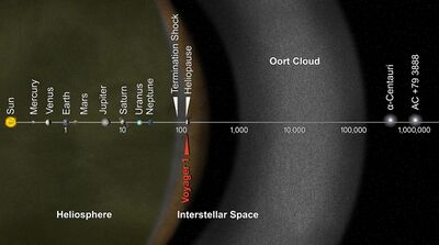 This is a logarithmic graph showing approximately the predicted range of the Oort cloud. The combination of small size and distance have left these objects beyond the capabilities of existing optical telescopes.