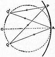 We will now consider in detail the important case in which uniform plane waves are resolved at a surface coincident with a wave-front (OQ). We imagine a wave-front divided into elementary rings or zones—often named after Huygens, but better after Fresnel—by spheres described round P (the point at which the aggregate effect is to be estimated), the first sphere, touching the plane at O, with a radius equal to PO, and the succeeding spheres with radii increasing at each step by ½λ. There are thus marked out a series of circles, whose radii x are given by x² + r² = (r + ½nλ)², or x² = nλr nearly; so that the rings are at first of nearly equal area. Now the effect upon P of each element of the plane is proportional to its area; but it depends also upon the distance from P, and possibly upon the inclination of the secondary ray to the direction of vibration and to the wave-front.