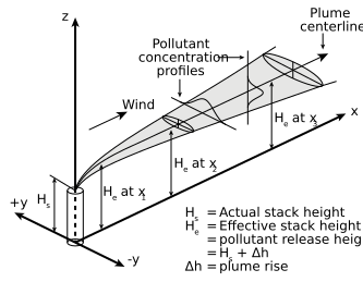 The technical literature on air pollution dispersion is quite extensive and dates back to the 1930s and earlier. One of the early air pollutant plume dispersion equations was derived by Bosanquet and Pearson.[48] Their equation did not assume Gaussian distribution nor did it include the effect of ground reflection of the pollutant plume. Sir Graham Sutton derived an air pollutant plume dispersion equation in 1947 which did include the assumption of Gaussian distribution for the vertical and crosswind dispersion of the plume and also included the effect of ground reflection of the plume.[49] Under the stimulus provided by the advent of stringent environmental control regulations, there was an immense growth in the use of air pollutant plume dispersion calculations between the late 1960s and today. A great many computer programs for calculating the dispersion of air pollutant emissions were developed during that period of time and they were called "air dispersion models". The basis for most of those models was the Complete Equation For Gaussian Dispersion Modeling Of Continuous, Buoyant Air Pollution Plumes The Gaussian air pollutant dispersion equation requires the input of H which is the pollutant plume's centerline height above ground level—and H is the sum of Hs (the actual physical height of the pollutant plume's emission source point) plus ΔH (the plume rise due to the plume's buoyancy).